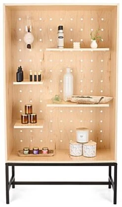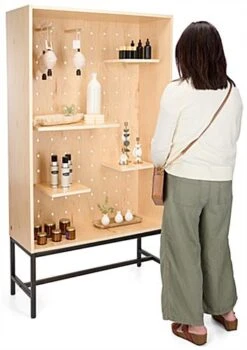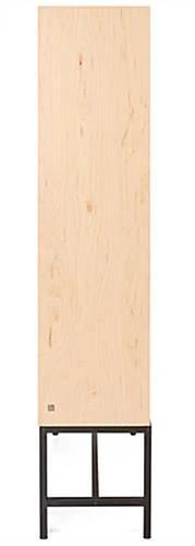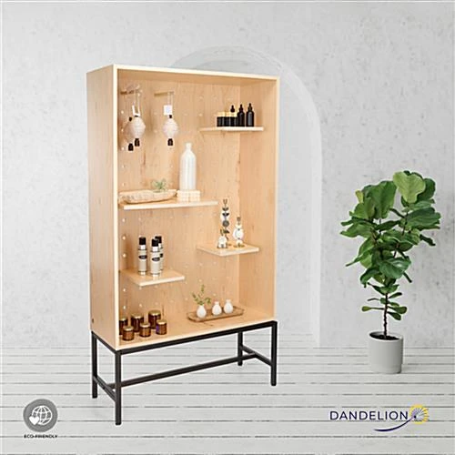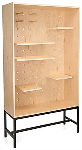 Looking for an eco-friendly and versatile way to showcase your retail merchandise? Look no further than our modern shadow box display with pegboard. This floor standing unit features five adjustable shelves, (3) at 10.5″ x 11″ & (2) at 22.5″ x 11″ and (20) pegs at 9.5″ each giving you plenty of space and flexibility to exhibit a wide range of items. Merchandisers can use the multifaceted design to create visually exciting and dynamic displays by configuring the pegs and shelves in countless ways. This eco-friendly showcase is constructed from sustainably sourced wood materials that are FSC® Certified making it a durable, environmentally friendly option for your retail store, boutique, or exhibit. It features a light maple finish and a sleek matte black stainless steel base, adding stability and elegance to any space. This shadow box display case with pegboard is perfect for any retailer who wants to creatively showcase their merchandise in an appealing and functional way.