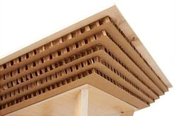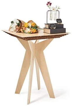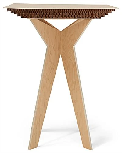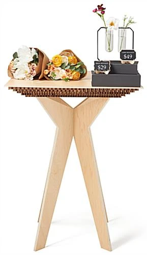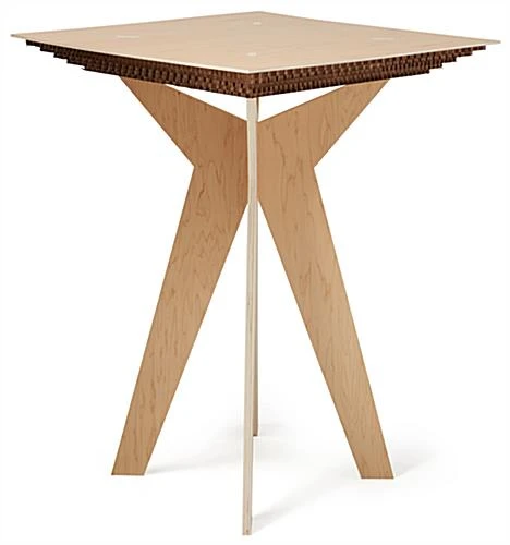 Our boutique display table is an innovative and eco-friendly merchandising solution that allows your best-selling products to be the main focus of any showcase. Perfect for boutiques, retail stores, pop-up shops, and market booths, this floor standing wooden high top features a collapsible design that quickly assembles and disassembles for easy storage when not in use. Each boutique display table with interlocking legs is constructed of lightweight, sustainably grown plywood with a modern natural wood laminate finish. An eye-catching five-layered cardboard design decorates the underside of each tabletop for an earthy elegance that effortlessly blends in with the decor style of any retail space. Floor-saving felt feet cap off the durable tapered legs of this eco-friendly boutique display table to prevent your selling floor from suffering damage during merchandising updates. This fixture stands at 41″ tall with a square 31″ wide tabletop that allows you to showcase an ample amount of product while taking up minimal space within your establishment. Arrange your best merchandise on this wooden floor standing high top for a compelling visual presentation that guests can browse through with ease.