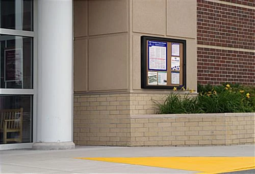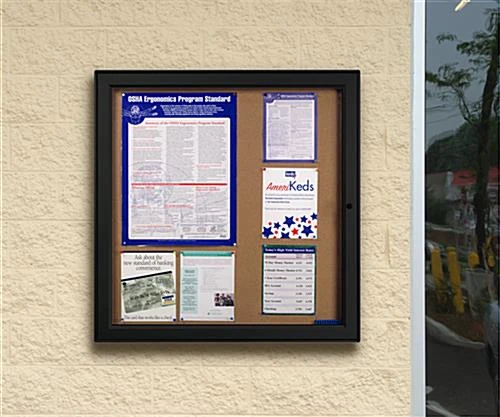 These notice boards, like tackboards are functional in providing a place to post announcements. These particular units are exterior-rated and resistant to weather. These notice boards employ a black gasket for a tight barrier against the outdoor elements. The frame of this tackboard is made of aluminum with a black finish. Each of the notice boards comes equipped with a lockable door for security. These large-format information centers can hold (12) 8 1/2″ x 11″ pages. The notice boards can be mounted in three different ways depending on installation. These tackboards are an economical alternative to more expensive models, and even come with a set of pushpins.