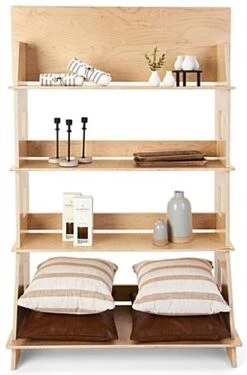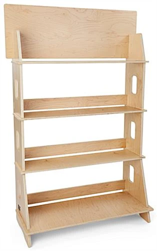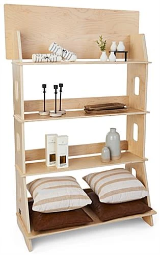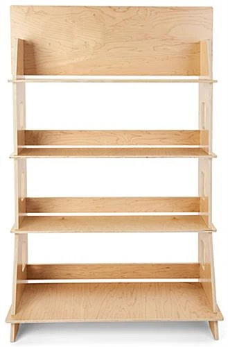 Our wooden knockdown shelf merchandiser is the ideal fixture for showcasing your best merchandise in pop-up shop locations, showrooms, retail stores, and more! This collapsible multi-tier shelving display makes your products the main focus of any presentation without clashing with the decor style of your space. Each knockdown shelf merchandiser is constructed of sustainably grown plywood with a natural laminate finish meant to help lower environmental impact and endure the damaging effects of a high-traffic environment. Designed to be used for temporary or permanent setups, this portable 4-tier display stand assembles and disassembles in a flash! The modular construction of this knockdown shelf merchandiser allows it to be highly portable, perfect for traveling exhibits such as trade shows, craft fairs, and art festivals. Coordinate this collapsible multi-tier shelving with matching fixtures () for a custom display that meets your merchandising needs. Captivate your audience’s attention and leave a lasting impression long after they leave your space with our portable 4-tier stand today!