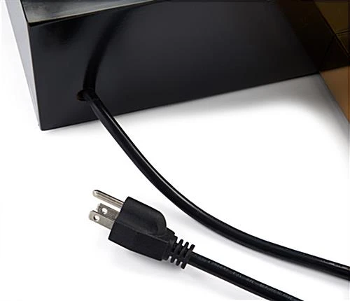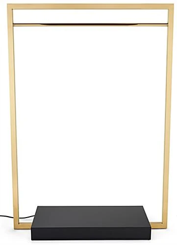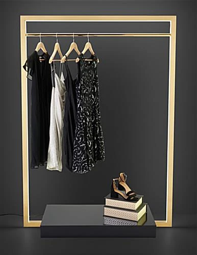 Our modern metal clothing rack has an eye-catching shiny gold finish and sleek ebony base that will add a contemporary touch to any retail store or boutique space. This freestanding garment display has overall dimensions of 46″ W x 18″ D x 70″ H providing ample space for clothes. Each gold modern metal clothing rack features built-in warm LED lights recessed into the frame, allowing you to illuminate your showcased items perfectly. The power cord is 54″ long and features a 3-prong plug design. This minimalist garment display has an overall weight capacity of 155 pounds, making it easy to showcase a wide range of products at once. The warm LED lights will help retail stores create a moody and eye-catching display that will draw customers in effortlessly. Pair this freestanding modern metal clothing rack with SMOFCPT and SMOFCCT for a well-rounded store exhibit that will lend a contemporary feel to your store.
