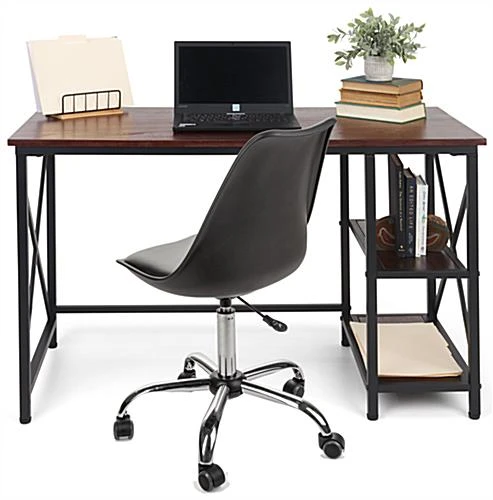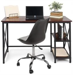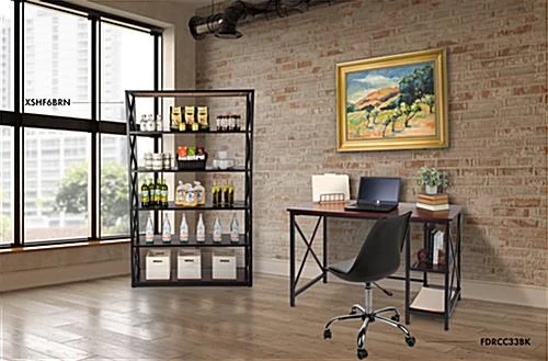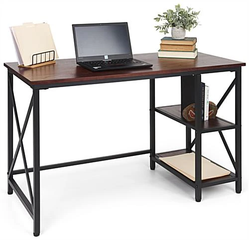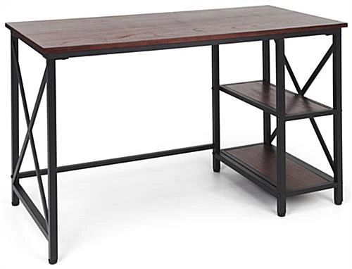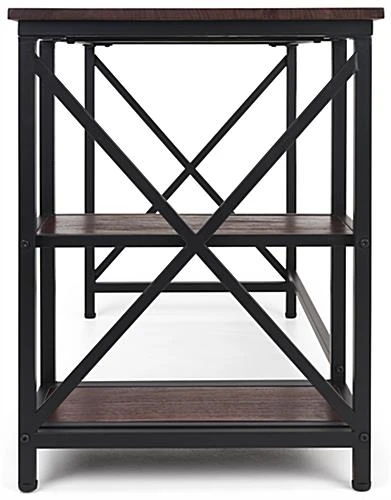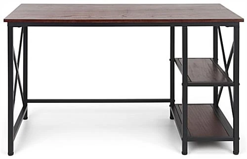 Our industrial style computer desk has overall dimensions of 47″ W x 22″ D x 30″ H and will add a modern touch to any home or corporate office space. The unit features a 47″ W x 22″ D dark stained wood top for ample workspace and a decorative steel X design on the sides for added interest. This modern industrial style computer desk has plenty of storage with two built-in shelves boasting an overall weight capacity of 110 pounds each, providing the perfect space for files, books, decorative items, and more! All four feet feature an adjustable rubber leveler, allowing you to adjust as needed for maximum stability. The table’s frame is made of heavy-duty black powder-coated steel, giving the unit durability with an overall weight capacity of 440 pounds. This wood-top industrial style computer desk will revamp your office décor and help you create a more modern-looking workspace instantly! Pair with similarly-styled and shelves for a cohesive furniture display.