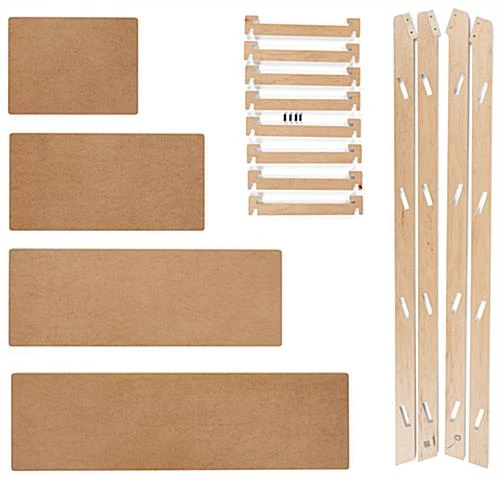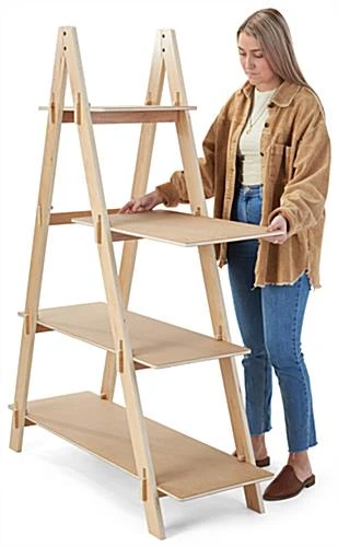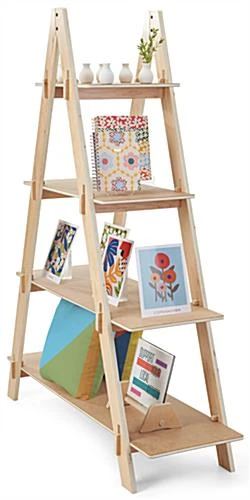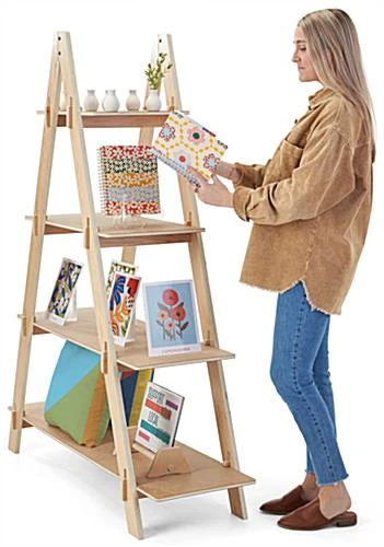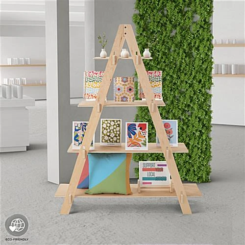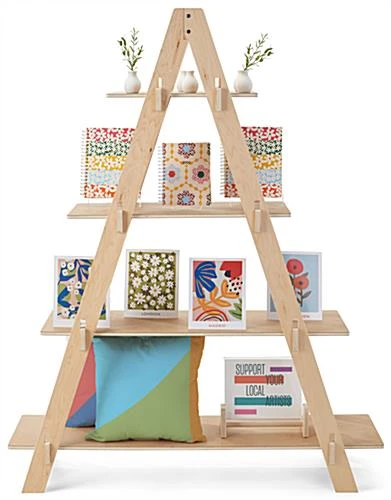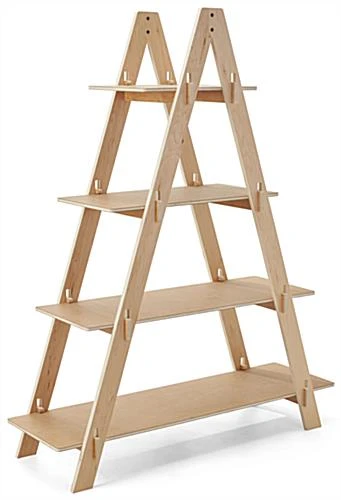 Our a frame shelf is the ideal fixture for showcasing your best merchandise in retail stores, boutiques, gift shops, and more. This 4-tier retail display makes your products the main focus of any presentation without clashing with the decor style of your space. This a frame shelf with natural laminate finish is constructed of FSC® certified poplar wood and 1/2″ thick high-density fiberboard shelves for a stable shelf design that can endure the damaging effects of a high-traffic environment. Designed to be used for temporary setups, each wooden merchandising fixture assembles and disassembles quickly. The lightweight build of this a frame shelf with flat-pack design makes it highly portable, perfect for traveling exhibits like tradeshows, pop-up shops, craft fairs, and art festivals. Coordinate this 4-tier retail display with matching fixtures (sold separately) for a custom display that meets your merchandising needs. Stand out in a crowd with this wooden shelving rack that will grab your audience’s attention and leave a lasting impression long after they leave!