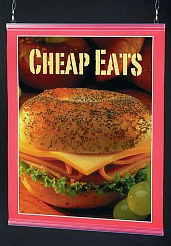 This poster holder kit is a great alternative to cheap plastic frames, or heavy metal frames. This banner hanger is very easy to change, easy to hang and are excellent marketing displays. Many companies are opting for this poster holder kit rather than wall mount frames to capture the attention of customers. By having these print frames suspended from the ceiling, it allows other signage or advertisements to be mounted on the wall. Large department stores, and grocery stores use this poster holder kit to advertise new products, or as a method of keeping customers informed of specials and store layout.