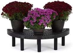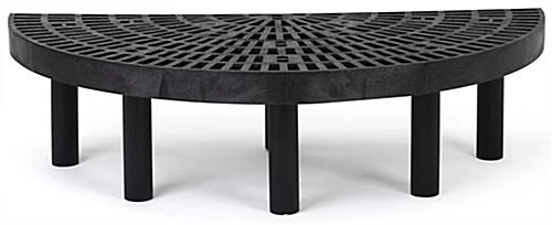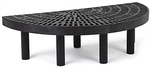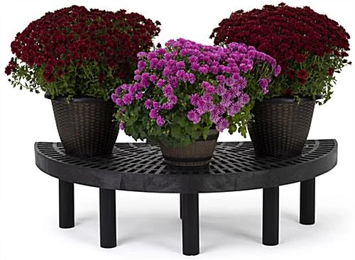 Our single-level half-round endcap display is a great way to entice traffic flow into aisles while taking advantage of smaller spaces within any retail environment. Each curved outdoor garden center fixture provides customers with a comfortable 180-degree shopping experience, perfect for showcasing all types of live goods, gardening tools, and general merchandise. Constructed of heavy-duty recycled plastic in a matte black finish, this single level endcap display with 48″ wide display space can withstand up to a total of 400 pounds. Ideal for home improvement retailers, grocery stores, and gas stations, place this grid top bench at the end of aisles to draw your customer’s eyes and maximize the visibility of your best merchandise. This single level half round display with modular design is easy to assemble, disassemble, and transport inside or outside your establishment due to its lightweight construction and tool-free assembly. Use this curved grid top bench alone against walls in tight places, or pair with our matching garden center fixtures to create a compelling showcase with ease!