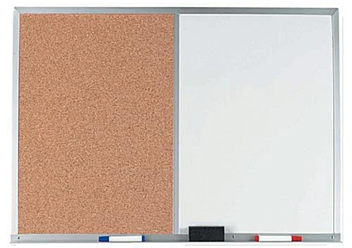 Dry erase board with corkboard is 48″ wide x 36″ high with a satin anodized aluminum frame to match your decor (Markerboard: 24″ x 36″; Corkboard: 24″ x 36″) . Your writing surface is a dry erase board and we have included a set of multiple colored markers and an eraser designed for this type of board. Includes storage tray to conveniently hold your markers and eraser. Hang on your wall with the provided mounting brackets and hardware. These have proven to be effective communications and teaching tools with our education and corporate customers. The combination of writing surface and bulletin board make a versatile and attractive unit.