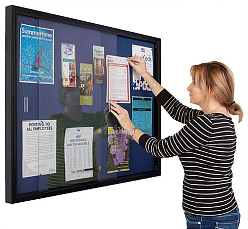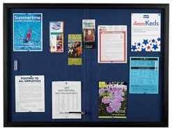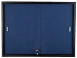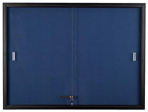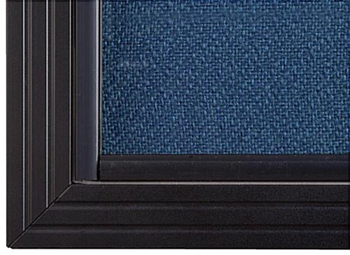 This blue fabric bulletin board is the perfect display to have for your school auditorium. The enclosed unit is equipped with 3mm tempered glass that glides smoothly on the tracks for easy front access. Sure to blend in perfectly, the black aluminum frame bulletin board will coordinate with any décor or setting. The corkboard adds a nice touch when posting notices and memos to make your news stand out. Featuring a turnkey lock, the bulletin board keeps items enclosed within the black aluminum frame and helps protect contents from prying hands or damage. Mount the display at the forefront of your business to promote events or employee achievements for years to come!
