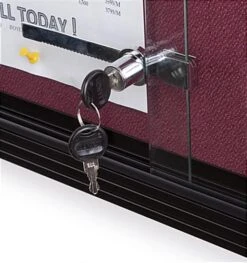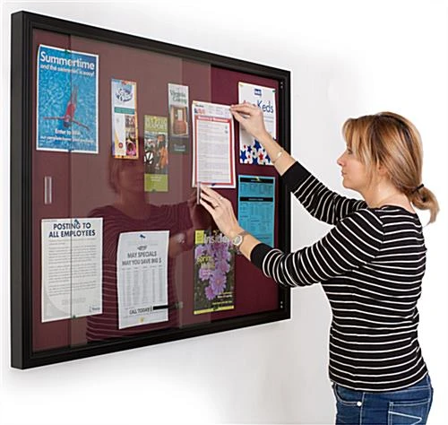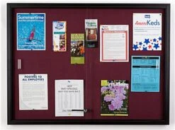 This sliding door fabric board is the ultimate message center for displaying important information and postings. A bulletin display, like the one seen here, is a great way to exhibit messages for those who pass by it. This pin board, sliding door fabric board has a beautiful anodized aluminum framing with semi-gloss black finish that blends nicely with any décor. The enclosed notice corkboard is usually mounted on the walls of foyers, lobbies, hallways and common areas. This indoor bulletin display, sliding door fabric board has a large display area with a tackable maroon color fabric. The surface of the tackboard is very durable and resilient, giving it longevity that will last for years to come. This 4′ x 3′ sliding door fabric board that has a tightly woven mesh fabric eliminates unsightly pin holes and will not crumble or fade like tradition corkboards. Each unit has a large maroon color fabric interior that can be used to hold up to (10) or (15) sheets of paper, standard size 8-1/2″ x 11″ paper. Businesses can use this sliding door fabric board that has a glass window to post posters, schedules, memos, photos, articles, menus or newsletters. Postings and messages can be attached on the fabric board by using push pins or thumb tacks. The cloth covered surface has a high-density backing that is designed for repeated tacking.