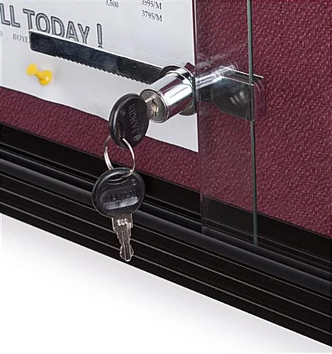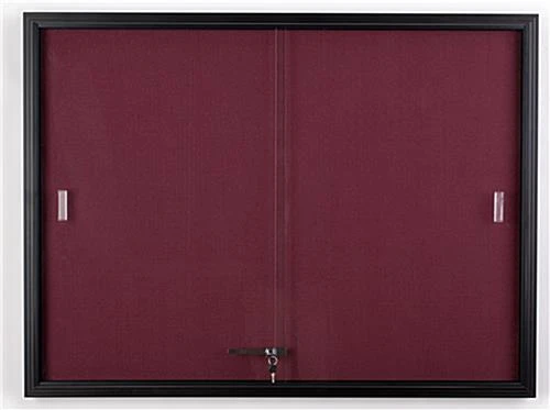 This enclosed sliding door fabric board, also called bulletin display has two front tempered glass windows. The shatter resistant glass doors slide smoothly on the tracks, providing easy front access to customers. This sliding door fabric board that is for indoor use is perfect for any public area such as restaurants, schools, lobbies, meeting rooms, classrooms or offices. In fact, because this maroon color tackboard is designed for use in public areas, the purchase of this product will include a locking mechanism to prevent unauthorized persons from remove postings from the menu case. Units will come fully equipped with Z-bar brackets, screws and wall anchors for easy installation. This enclosed message display is meant for indoor use only. However, this website also offers outdoor lockable menu cases and swing-open corkboards (see related products on the right for more options). Brighten up your room today by adding this maroon color bulletin display. Sold at this price, this enclosed menu case is definitely a great buy!