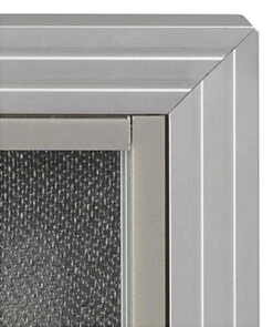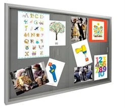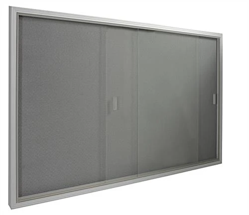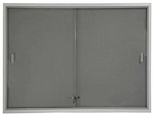 A glass bulletin board, that has sliding doors, features a cork backing. These corkboards are covered with a gray colored fabric. This glass bulletin board, that is a cork display, will complement many environments. The silver aluminum frame and gray fabric are both attractive and functional. Users can easily open and close the sliding doors constructed onto this glass bulletin board, also known as an indoor tackboard. The unit is lockable and durable for long lasting use. An indoor cork display, glass bulletin board can be mounted to a large wall space in a busy location!