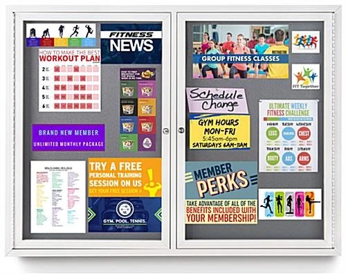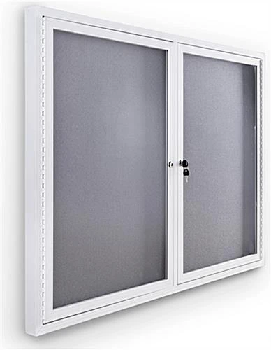 This indoor enclosed bulletin board cabinet with fabric backed corkboard will organize any notices within your gym, library, hotel, school, or conference room. Keep all messages protected with the shatter-proof polycarbonate swinging doors and secure locking mechanism with two keys. This indoor enclosed bulletin board cabinet has a clean white aluminum frame for an impactful display, and the gray fabric backed surface stays looking new after years of punctures to the corkboard. Use the included hardware and easy setup instructions to mount to any wall in high-traffic areas in no time at all. Perfect for fastening with pushpins or drawing pins, this large polycarbonate tack board can be updated frequently so your patrons stay aware of important safety procedures or upcoming events. Use this hanging indoor enclosed bulletin board cabinet with white aluminum frame to showcase unique displays within your hospital, elementary school, or office building today!