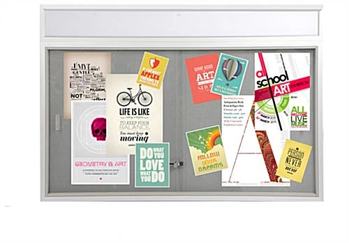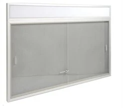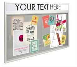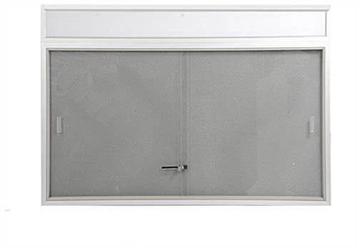 This indoor enclosed bulletin board, that is a display case, is designed with tempered glass doors. The shatter resistant unit slides smoothly open and closed for easy access. An indoor enclosed bulletin board, with header, is used to display custom text above the corkboard which can be done by a local sign shop. These display cases is for use inside public areas such as libraries, classrooms, community centers, and offices. Each indoor enclosed bulletin board, also known as a fabric pinboard, easily mounts to the wall. The lockable unit will keep items safe inside. This display case, indoor enclosed bulletin board is sold at an affordable price in a wide range of styles!