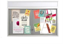 Each indoor enclosed bulletin board is a great tool to display messages and notices to the public. An aluminum frame surrounds the interior space of the corkboard. This indoor enclosed bulletin board, with glass doors, slides open and closed. The pinboard has a silver finish with a fabric backing to complement any décor. An indoor enclosed bulletin board, that has an aluminum frame, has a large display area to tack a significant amount of information and messages. The display cases are both durable and resilient. Each indoor enclosed bulletin board, that has fabric backing, features a 4’ by 3’ space of corkboard. Each unit can hold up to (10) or (15) sheets of paper, standard size 8-1/2″ x 11″ paper.