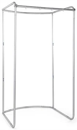 This pop-up black dressing room booth offers a sleek solution for privacy, ideal for any indoor trade show environment, retail store, backstage area, or voting center. The lightweight aluminum frame is easily assembled in a matter of minutes without the need for any tools due to the numbered push-pin poles that lock into place. Visitors will have comfortable space within the 4’W interior of your pop-up black dressing room booth, which stands at 7.5’H to accommodate even the tallest of patrons. The machine-washable fabric is flame resistant for safety, and the sleek black color maintains its dark shade over time while concealing any potential dirt before cleaning. Easily apply the side and back panel by sliding the pillowcase design over the aluminum poles and securing with the zip enclosure. The matching solid curtain simply hangs from the top front bar with the included rings. The knockdown design makes disassembling the frame even faster, and all pieces fit neatly into the included carrying bag with ID tag for easy transportation. This portable pop-up black dressing room booth is a discreet yet useful addition to any fitness studio or pop-up shop, and will allow your unique environment to shine while customers enjoy privacy within your establishment.