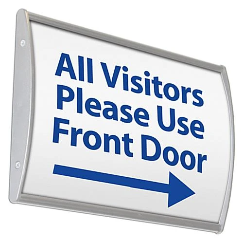 These office signs that offer direction are an affordable, yet visually-pleasing way to display corporate signage. Constructed from durable anodized aluminum with plastic end caps, this frame can last for many years to come, without going out of style! The nameplates include an anti-glare lens for easy viewing. The lens also protects the displayed graphic from getting damaged. These wall displays, cheap office signs are sold with no artwork included. However, customers can create and print their own signage using a regular printer. These office signs for doors enable users to quickly and easily change their graphics as well. Simply use the provided suction cup to lift the overlay, and place the prints underneath.