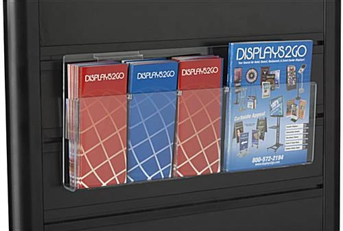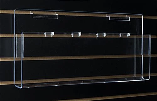 Slat wall Accessory – This attachable brochure rack is great for slat wall panel displays. This accessory can hold either five 4″ wide literature or (2) 8.5″ wide and one 4″ wide materials. It can be attached directly to most slat wall displays without any other mounting hardware. Clear acrylic construction ensures that your brochures are securly positioned onto the slat wall but customers of visitors will still be able to read the entire front of the brochure or catalog you choose to display. Use in conjunction with any of our sign holders to be even more informative.