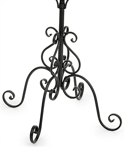 This wrought iron style hat rack is perfect for any boutique or souvenir store. Each black decorative stand includes (2) options for hanging items. The hat rack includes (5) 3 hook attachments for caps, fedoras or sunhats. The baseball cap fixture also supplies (2) black 8 prong pieces for coats or scarves. The hat rack hooks rotate to make shopping hassle free for customers. A decorative finial topper and base create a classy design for the baseball cap stand.