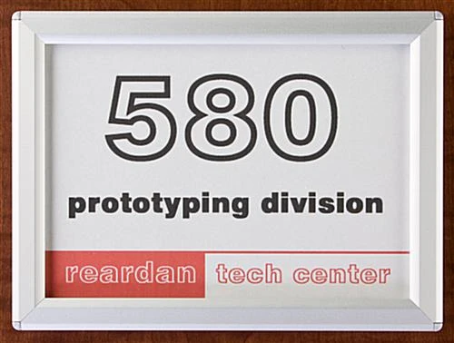 Each of the four frame edges flip open to provide access to the sign area. Place your graphics with the lens inside the aluminum office door sign and simply snap the sides shut. That’s it! A big advantage to these conference room signs is their ease of use. This business signage, aluminum office door sign can be changed without removing it from the wall. Think about how easy it will be to update room numbers, safety signage, and more! Buy this aluminum office door sign for your interior wall applications today at a very attractive price!