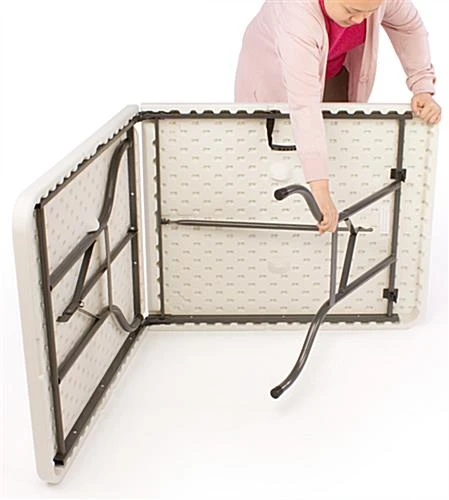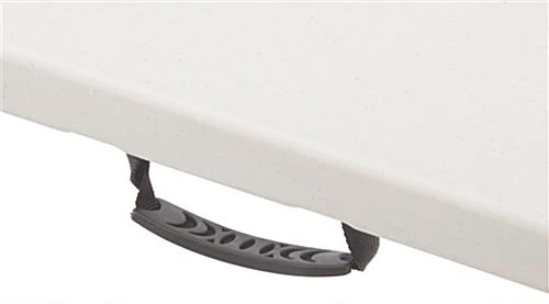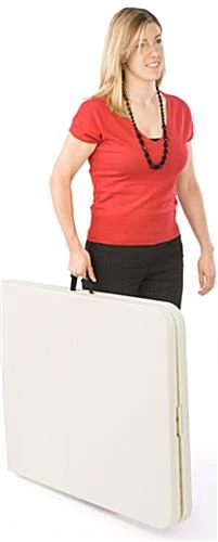 Complete your trade show booth with this portable exhibit display table that can be used by staff members or attendees. Featuring folding legs, this foldable exhibit display unit can be folded together for easy transportation and storage purposes. There is also an easy grip handle that is ergonomically designed to allow you to carry the portable trade show table to and from your exhibitions. This plastic tabletop, also known as trade show counter or event display, can also be combined with a tablecloth or table skirt for a professional look. This portable table is compatible with most of the throws and covers we offer, giving you the option to make this unit more presentable. This folding furniture ships fully assembled, and requires users to merely unfold and lock in place. Buy this portable table for use at your next big event!