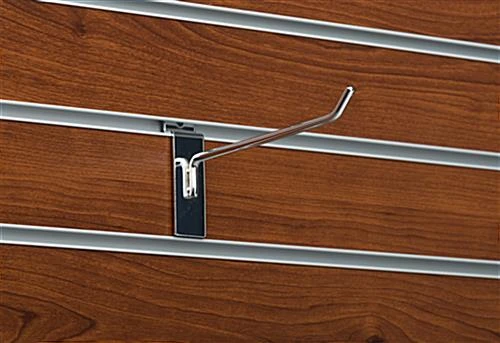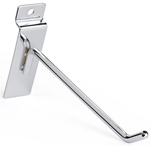 Made using heavy duty metal and finished with a gloss coating, this 6” chrome peg hook for slat panels can be used for years to come. Display merchandise in your retail store with ease using these versatile hangers that come in a set of 25. The 30° angled chrome peg hook for slatwall fixtures keeps items securely in place without worry of slipping off.