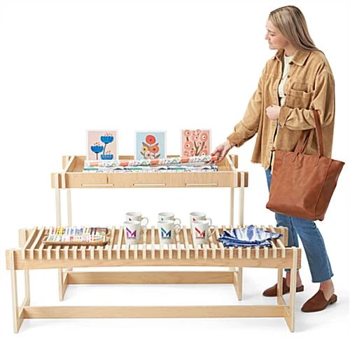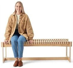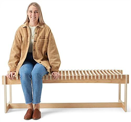 Our slat bench is an easy merchandising solution perfect for creating additional sitting spaces on your selling floor for customers and guests. Suitable for traveling events like trade shows, craft fairs, and pop-up shops, this 5 foot wooden seating fixture features a collapsible design that allows for quick assembly and disassembly without the use of any tools. Thoughtfully designed and crafted to elevate any space, each slat bench frame is constructed of lightweight poplar wood with top slats made of 3/4″ thick high-density fiberboard, resulting in a highly portable display perfect for traveling events. The sleek Japanese joinery technique makes it easy to put together and eliminates the need for excess metal hardware. As an added benefit, this 5 foot slat bench pairs perfectly with DBDTAB1 ( ) to create a modern custom showcase that accommodates your merchandising needs. Our eco-friendly wooden seating will make it easy to create an elevated exhibit within your retail space or at your next traveling event that will be sure to grab the attention of guests passing by!