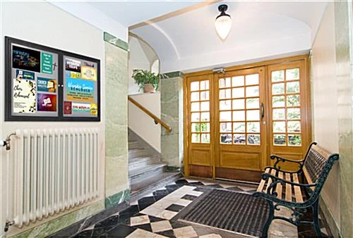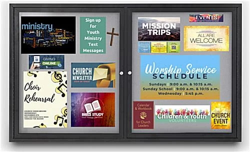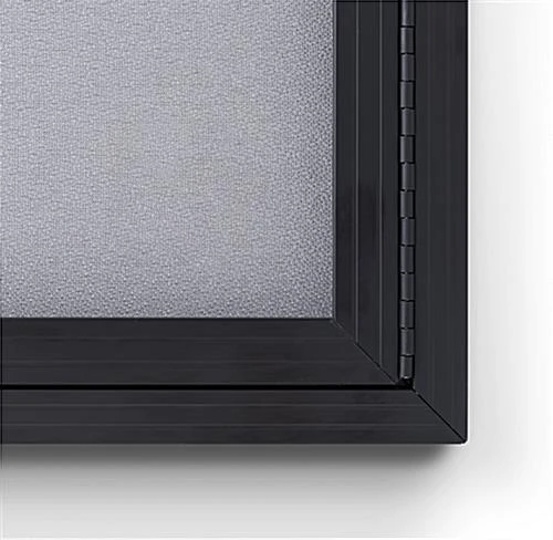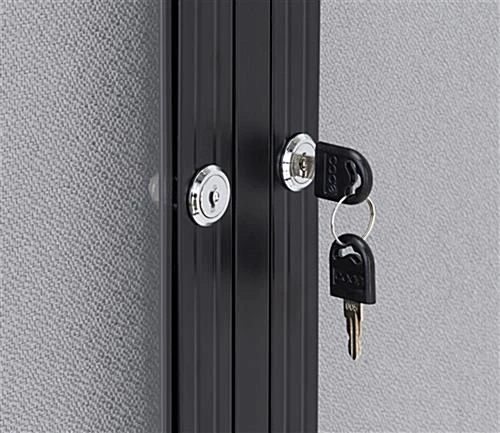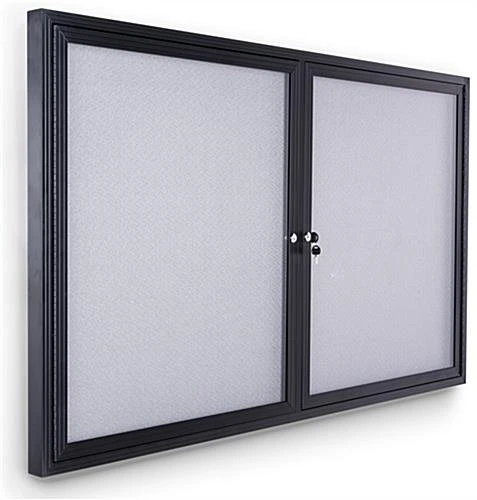 This polycarbonate notice board with lockable enclosure will safely display messages to patrons and guests within any church, office building, waiting area, or community center. Easily swing open the two shatter-proof cabinet doors for quick access, and use the included set of keys to securely lock shut and keep your announcements safe. This enclosed polycarbonate notice board has a sleek black aluminum frame perfect for any contemporary setting, and the gray fabric-covered corkboard maintains its clean professional appearance after repeated use. All hardware is conveniently included so you can quickly mount to any indoor wall to effectively grab the attention of patrons. Hang schedules, menus, or check-in information inside this lockable enclosed cabinet with the simple use of pushpins, which allow you to frequently update with ease. This shatter-proof polycarbonate notice board with black aluminum frame is the perfect addition to any professional environment where customers and visitors are present.