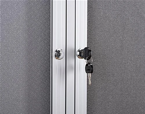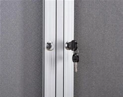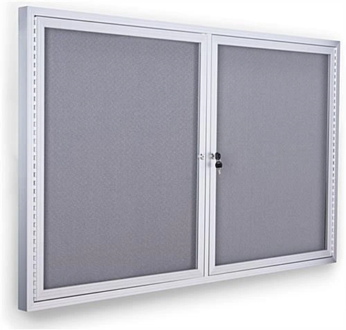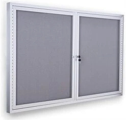 This enclosed polycarbonate bulletin board is a secure way to showcase important notices within your university, doctor’s office, conference room, or hotel. The shatter-proof swing doors open 180 degrees for easy accessibility and securely lock shut with the included set of two keys so your messages stay protected. This durable enclosed polycarbonate bulletin board has an aluminum silver frame that matches any decor, while the gray fabric hides any marks in the corkboard underneath. Easily use the hardware that’s included to mount to any wall indoors for effective placement in high-traffic areas for guest and visitor awareness. Fasten pictures, directories, or infographics to this message board with the simple use of thumbtacks or drawing pins so you can easily rearrange and create a unique display. This long-lasting polycarbonate bulletin board with aluminum frame and locking swing doors will beautifully showcase your notices for customer attention within any environment!