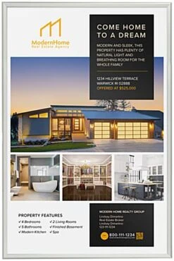 The poster snap frame is a sign holder that holds your advertisements in any indoor environment. A plastic covering made from water resistant PVC plastic protects your poster. The protective cover is also non-glare and will stay visible in the sunshine and light. The 60 x 40 poster snap frame is constructed out of aluminum which makes it resistant to rust.
