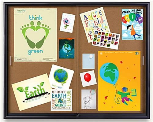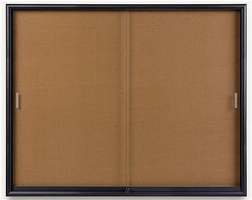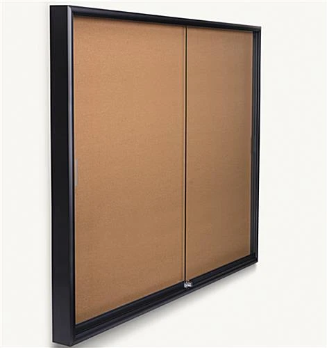 Each corkboard, also known as a bulletin board, can be used to display items such as notes, reminders, posters, schedules, maps, directories, articles, and memos. Messages can be tacked to the cork by using thumb tacks, push pins, or staples. This corkboard, that is 5 feet wide, is designed with tempered glass doors. The doors include rolling guides for easy access use. Each corkboard, that is used for a school or library, easily slide open and closed for quick changes and updates. This wall fixture includes all the necessary hanging brackets for a sturdy display. A bulletin board, corkboard is ideal for businesses to show important events and announcements in a busy public area.