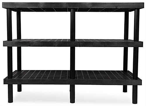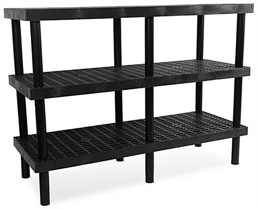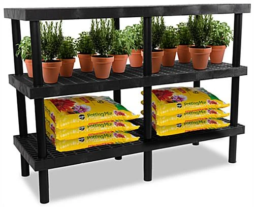 The greenhouse 3-tier plant shelf measures 66″ in width by 48″ in height and provides an abundance of space to exhibit seasonal displays, live goods, fertilizer, or a variety of potted plants. This plastic, exterior-rated fixture comes equipped with three grid top shelves, perfect for any garden center, grocery store, nursery, or landscaping supply store. This greenhouse 3-tier plant shelf is created with an eco-friendly plastic, exterior-rated design, ensured to withstand severe weather conditions throughout the year. This garden center unit comes in a sleek matte black finish that is sure to complement all merchandise at your nursery, corner store, or farmer’s market.