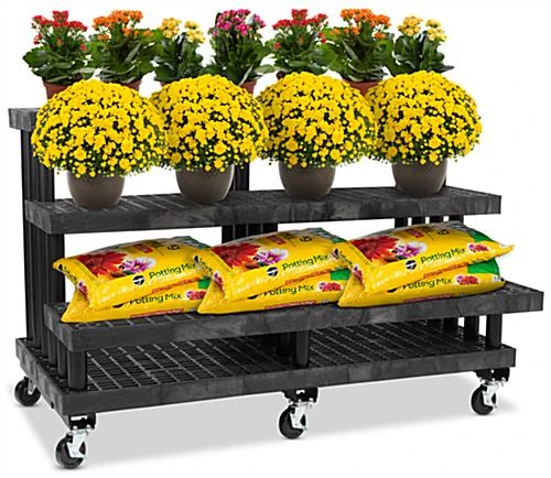 This rolling commercial nursery rack is the ideal merchandising addition to your garden center or greenhouse. Our garden center display features a sustainable weather-resistant design with 6 heavy-duty caster wheels for quick and easy adjustability at your farmstand, corner store, or greenhouse. The 3-tier nursery rack provides ample space for merchandising your products to create an impactful shopping experience. Mix and match from our garden display center series to have a unique and complete setup at your floral shop or retail store.