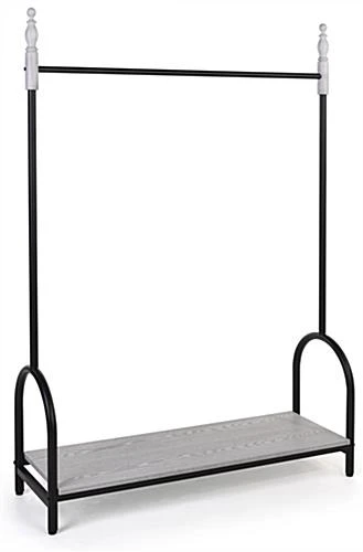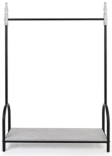 Placing this whitewash and vintage style garment display rail on your retail floor instantly elevates the look and feel of your retail selling space. This high-end, refined clothing rack features a soft grey hand-rubbed application over white, which creates a romantic whitewash finish. Our vintage style garment display rail also features a 48” wide black metal powder-coated bar, which is ideal for hanging your finest attire. The beauty of this clothing rack with its decorative capped rails, creates a high-end look that will stand the test of time. The 56” shelf clearance assures effortless hanging of your most elegant attire on this romantic and decorative piece. Purchasing this whitewash garment display with metal rail will put you well on your way to creating an eye-catching shopping environment for your patrons.