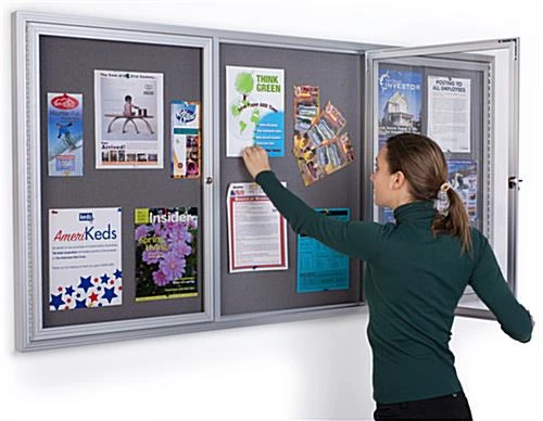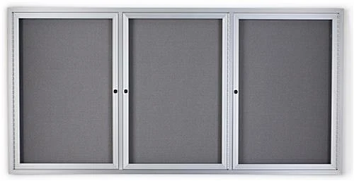 Just like regular corkboards, this fabric tackboard that has a large, interior light gray fabric covered surface accepts thumb tack and push pins. Messages and postings can be easily attached on the pin board in just seconds! Not only is this indoor fabric tackboard easy to use, but it also hides pin holes and will not crumble like regular corkboards. The interior self-healing surface makes the unit perfect for repeated tacking and remains free from damage even after years of use. This indoor corkboard, enclosed fabric tackboard also provides easy and convenient front access. There are 3 swing-open doors that open up. Once this fabric tackboard that has swing-open doors is mounted to the wall, users can easily change the updates. Each swing-open door has a built-in tumble lock with 3 set of keys provided to secure the case from unauthorized removal. This allows businesses to mount the lockable bulletin board in a common area with peace of mind. An enclosed corkboard, like the one seen here, is completely reusable for many years to come. There are mounting brackets, wall-anchors and screws provided for easy installation. These enclosed bulletin boards are offered in other sizes and designs as well. Shop online to see the entire covered corkboard collection!