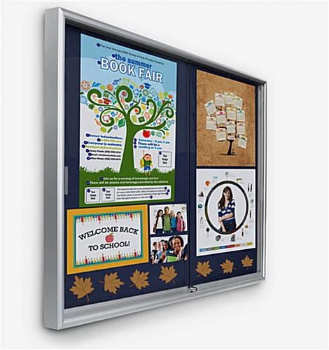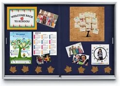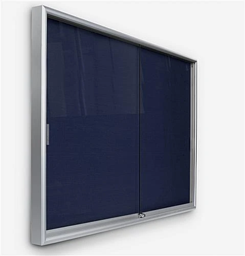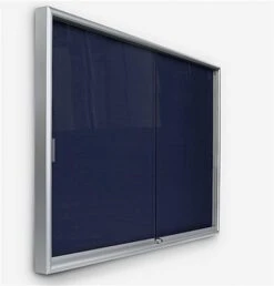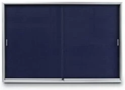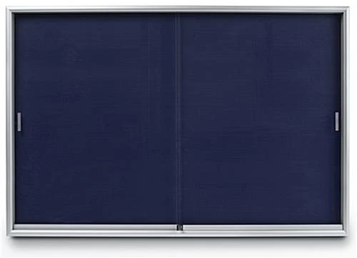 All display bulletin boards, that have a blue fabric tackboard, include tempered glass doors. These doors are designed with rolling guides for easy use and access. In minutes, users can change the information tacked to one of these display bulletin boards, also known as a fabric tackboard. Users can easily glide the doors closed and open. These wall-mount corkboards, display bulletin boards, are the optimal way to post current information, school photos, library hours, and any other media in a busy location!