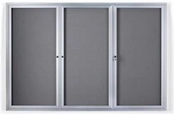 This fabric cork board is a great way to get word out to the public. The bulletin corkboard is designed for use indoors only. This cloth covered tackboard, fabric cork board is durably constructed with an anodized aluminum frame featuring a matte silver finish. The durable fabrication makes the unit great for long-term use in public areas, such as a school or community center. This wall-mount pinboard, enclosed fabric cork board features a large interior cloth covered surface. The interior cloth covered surfaces hold up to (24) 8-1/2″ x 11″ sheets. An indoor fabric cork board, like the one seen in here, can be used to display posters, maps, schedules, notices, menus, postings and memos. Messages can be easily attached to the interior surface using thumb tacks or push pins. This fabric cork board that has 3 segments gives users ample space for posting an assortment of print-outs and important information. Unlike regular corkboards, this enclosed tackboard can hide pin holes and will not crumble after many years of use. This fabric cork board that has a self-healing, cloth covered surface is ideal for repeated tacking.