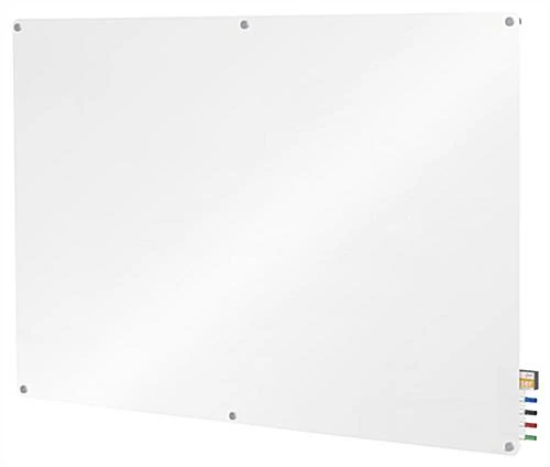 This glass dry-erase board is ideal for use in any office or conference room. The large writing surface provides plenty of space for collaborating on projects, brainstorming ideas, training for new skills, and more. Each 72” x 48” dry-erase board has a unique frosted finish for a polished, professional appearance. The writing surface is resistant to stains and wipes off cleanly without leaving any residue behind. A discreet caddy holds the four markers and eraser included with your purchase. Each dry-erase board is wall mounting and hangs from silver standoffs that will match the existing décor in any office or conference room.