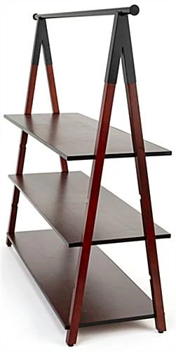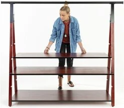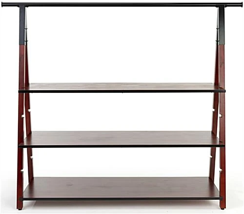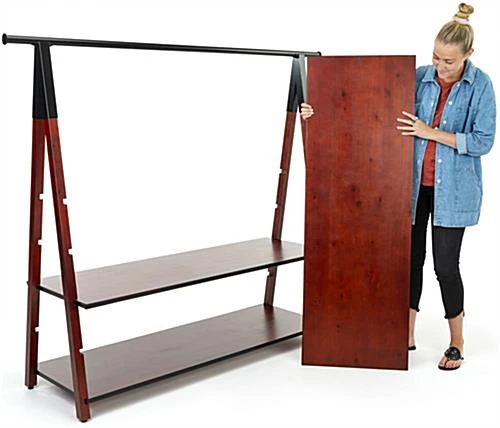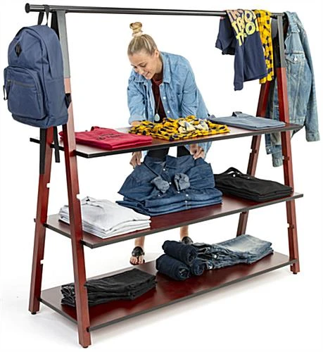 Our modular wooden a-frame clothes rail makes it easy to step up the visual merchandising displays in your retail store, boutique or showroom. This geometric industrial clothing rack holds anything from t-shirts, to jeans, hats, handbags, and more. With a black powder coated metal hanging rack and three 50″ wide x 20″ deep adjustable shelves, each wooden a-frame clothes rail has a rustic and contemporary design that effortlessly mixes style and functionality. This sturdy, easy to install garment rack features four shelf notches in its frame, to allow height adjustment. Made of two-toned dark brown wood with black industrial metal accents, this modular clothing rack serves as the perfect arrangement for extra product that customers can browse. Provide a contemporary addition to any space with this wooden a-frame clothes rail designed to make your merchandising stand out.
