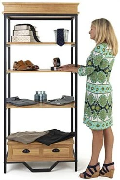 Our sophisticated French industrial bookshelf etagere is the perfect storage solution for any retail store, showroom, trade show, or home setting. Whether you need to showcase handbags, shoes, apparel, or home décor, this multi-tiered display has an open design that allows your product to be the focal point of your visual merchandising. This industrial bookshelf etagere with four shelves and faux decorative drawer is crafted from lightweight MDF with a durable black powder-coated steel frame. Each floor standing store fixture additionally features a rustic natural oak finish and elegant crown molding that finishes the top of this shelving unit. This durable multi-tiered display supports up to 220 pounds of weight and withstands high-traffic retail environments. Refresh any space with this floor standing bookshelf etagere that simultaneously provides multiple merchandising opportunities with a sophisticated look and feel!