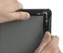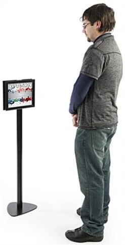 This 8.5β x 11β modern sign stand is the ideal aluminum pedestal for advertisements. The double sided poster holder is great for showcasing your graphic designs in prime locations where customers enter and exit your store. The floorstanding sign stand includes 2 non-glare PVC lenses to protect your posters from smudges or dust. Each aluminum pedestal is equipped with a snap open frame which makes installing your photos fast and effortless. The holder for the sign stand is engineered with mitered corners providing a solid construction for long term use. Station your poster support in a prime location for instant promotion with your eye-catching design.