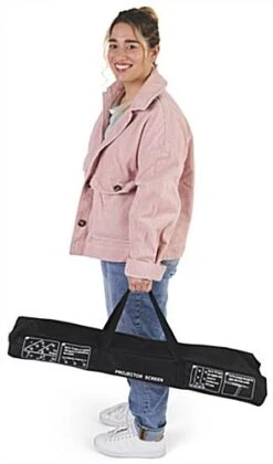 This outdoor movie projector screen is lightweight, making it highly portable in classrooms, outside tradeshows, graduations, and home theaters with friends and family. The yard display is made of wrinkle-free polyester that can be machine washed, providing a sleek and clean appearance at all times. Our floor standing portable outdoor movie projector screen also has a collapsible aluminum frame and plastic joints that can easily be assembled within minutes without any tools required. This convenient and versatile display allows you to quickly set up and break down where ever you choose to gather as a community or company. The 100″ diagonal yard display has a 160° wide viewing angle and 16:9 aspect ratio, allowing someone to sit comfortably where they choose. This lightweight floor standing fixture includes a black carry case with the assembly instructions conveniently printed on the side to have at all times. Also included are 4 ground stakes to provide a stable and secure display while using it outside watching films or participating in an outside school event. Use our collapsible outdoor movie projector screen to create a bright, clear image while enjoying a film, graduation, outside presentation, conference, and more.