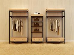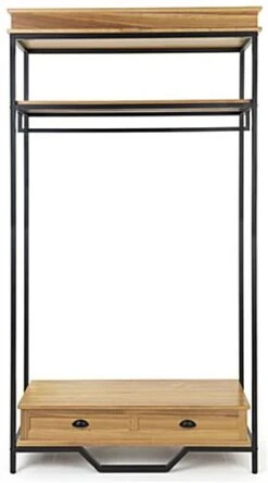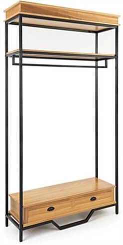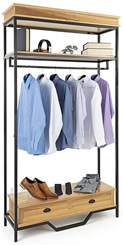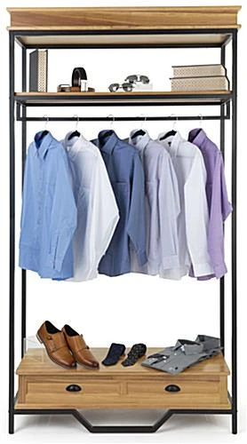 This industrial rustic clothes rack with faux decorative drawer is excellent for displaying clothes, shoes, jewelry, home decor, and more. Made of durable MDF in a natural oak finish and matte black metal framing, this high-end store display can withstand up to 220 pounds of merchandise. Each industrial rustic clothes rack features a powder-coated frame that stands on four leg levelers for added stability. This multi-tiered retail fixture provides ample storage for merchandising with an overall height of 90.5” and a shelf clearance of 54” between the faux decorative drawer and garment rail. This two-tone 47” wide store display will make a statement in any space that will help your products stand out. To add an overall high-end look and feel to your merchandising, pair this industrial rustic clothes rack with our coordinating natural oak pieces. This multi-tiered display will be the perfect refresh for your boutique, showroom, trade show, or home!