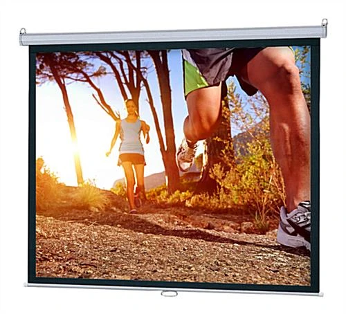 This model uses nylon bearings to provide smooth movement and keep the noise of operation down. The projection screen is height adjustable up to 69″ long. The projector display surface features a retracting design much like a window shade. When not in use, the projection screen retracts back into the cassette to keep it clean and free of dirt. This also keeps the unit out display surface out of sight providing a more organized look for a boardroom or classroom. The projection screen measures 69″h x 92″w which equates to a 120″ diagonal measurement. That’s ten feet of overall area to showcase images, videos and business plans. Although this projection screen only weighs 28 lbs. it should still be mounted to a wall stud or ceiling beam for a safe display.