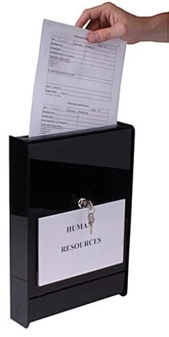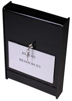 This black wall mount ballot box is a great addition to the office environment. This holder features a lock and an insert slot on the top, making it perfect for holding confidential documents and payments. The ballot box that holds 8-1/2″ x 11″ documents features an 8-1/2″w x 5-1/2″h name plate for posting the type of documents the display is meant to collect. Keep payments and private letters from employees safe in this secure office document holder. Store any size document in this secure locking holder. This container will ensure confidentiality and safe transfer of important papers.