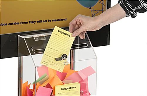 Promote your product and attract customers with this silver sign stand with sweepstakes box. As a floor display, this acrylic ballot case gives you more reach and visibility than a countertop collection bin. This double sided sign stand can display two 22” x 28” posters back to back within the frame. Use eye-catching material to advertise your promotion or contest to ensure your acrylic ballot case is filled to the brim. Courtesy of its simple yet polished design, this sign stand can be used as a floor display in nearly any setting, including community centers, museums, tradeshows, and more. Keep your received suggestions, donations or contest entries secure with this container’s locking lid.