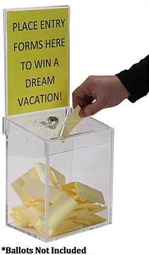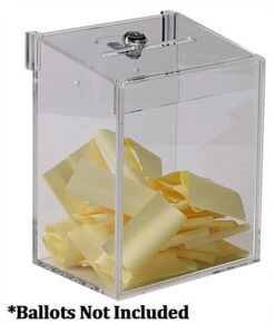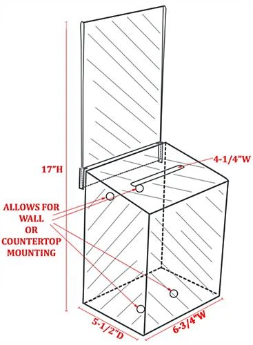 These clear acrylic donation boxes can be used to collect monies for charities or collections. The display bin is constructed from 100% acrylic. The donation boxes come with a top locking panel to deter tampering of ballots. The display’s top panel can be removed by grabbing the panel by the mouth and pulling straight up. They come with a set of (2) keys so personnel can quickly access the contents. The suggestion display’s top panel can then be inserted back into place. The suggestion display has 4-1/4″w mouth so comment cards can easily be inserted into the bin.