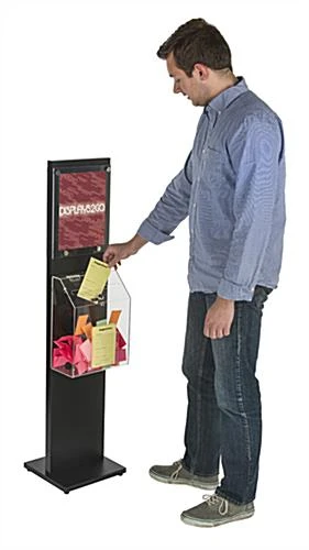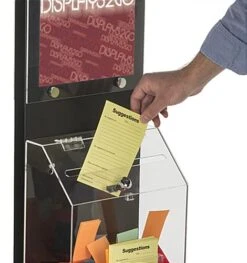 For those seeking quality feedback from customers, a black floor standing lead box is a sturdier and more dynamic option than your standard countertop contest bin. At more than four feet tall, this sign display draws the attention of a passerby in even the most congested areas. Each acrylic ballot lead box features a locking lid to easily and safely secure its contents. Its sleek and clean design gives you the freedom to use this display for a variety of functions, including at fundraisers for a donation collection or at a restaurant for a contest. Add dimension to your lead box by putting eye-catching graphics in this double sided sign holder. Place suggestion forms in the acrylic ballot bin’s front pocket for added convenience.