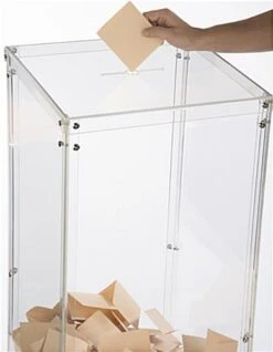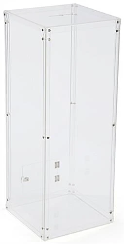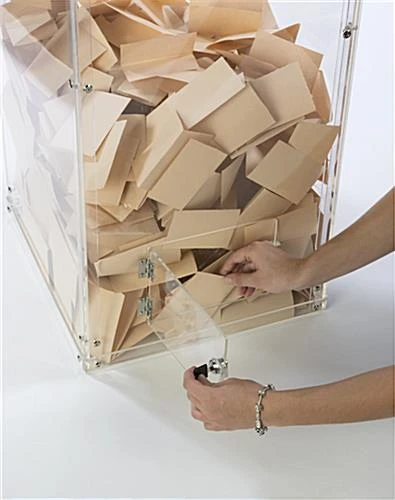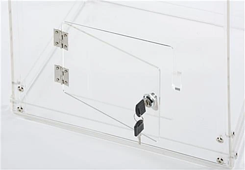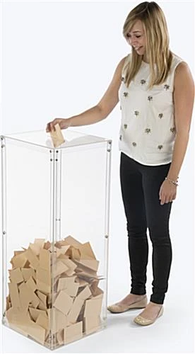 The acrylic donation box is a larger fund raising bin standing at 40” tall and 15.5” wide. Collect money, suggestions, or raffle entries with the display! An insert slot on top of the ballot box can fit 5”w x .25”d collection papers. Located at the rear bottom of the fund raising container is a locking door which opens on hinges. Make the collection of ballots easy by using the door when the box gets full. Constructed of clear plastic, the locking entry bin is completely transparent which allows passerby to see the funds or raffle tickets inside.