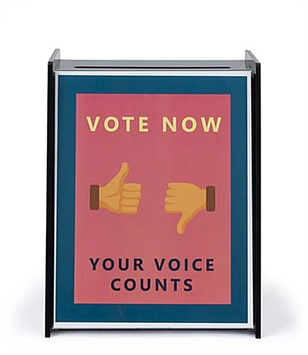 The key feature of our full sized ballot box, lucite suggestion box is its ability to display your 8-1/2″x 11″ graphics for full-face viewing. Change your message or promotion anytime with this comment box model! This attractive black acrylic ballot box measures a generous 11″ tall x 9″ deep. The protected clear acrylic sign holder functions as a slide-away cover that latches to the back of the box. Drop slot is 7″ long by 1/2″ deep for easy accumulation of many entry forms or ballots, making this an unique acrylic suggestion box.