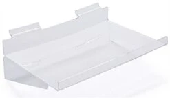 Add this sturdy acrylic shelf to your inventory of Slatwall accessories for supporting heavier objects. There is a brace in the rear of the shelf to support the weight and a raised lip in front the keep objects in place. This shelf will fit all slatwall products that we sell. Dimensions are: 3/16″ thick acrylic. 16″ wide x 10″ deep.