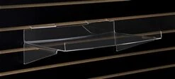 Add this sturdy acrylic shelf to your inventory of Slatwall accessories for supporting heavier objects. There is a brace in the rear of the shelf to support the weight and a raised lip in front the keep objects in place. This shelf will fit all slatwall products that we sell. Dimensions are: 3/16″ thick acrylic. 16″ wide x 10″ deep.